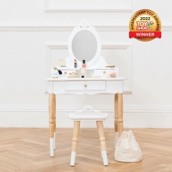 Bezpečné akrylátové zrcadlo ve viktoriánském stylu, chytrý dvoupatrový úložný prostor a tři zásuvky poskytují místo na drobnosti a hračky. Výrobek je eticky vyroben z udržitelného kaučukového dřeva a malován netoxickými barvami na vodní bázi – skvělá volba pro zdravé a stylové dětské prostředí.