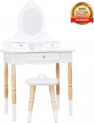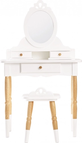 Designový toaletní stolek se stoličkou v nadčasové kombinaci bílé a přírodního dřeva okouzlí detaily i funkčností. Díky pevným materiálům a preciznímu zpracování je ideální do dětského pokoje či herny a podporuje kreativní a rolovou hru, sebevyjádření i jemnou motoriku.