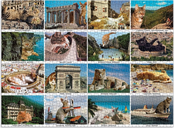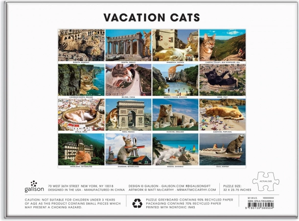 Vtipné puzzle s kočkami na prázdninách o 1500 dílcích nabízí zábavu a relaxaci. Obsahuje šestnáct realistických fotografií, ve kterých si můžete vychutnat kočky kochající se známými místy světa.