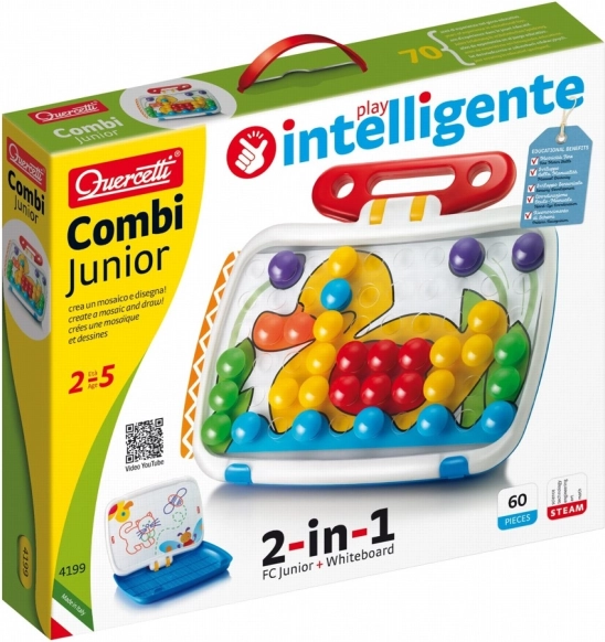 Objevte hravou kreativitu s 2v1 sadou QUERCETTI COMBI JUNIOR – z jedné strany pestrá mozaika se šesti oboustrannými předlohami, z druhé strany velká bílá tabule pro suché mazání. Díky snadnému mechanismu lze podložku zvednout, sklopit a otočit během chvilky. Přenosný kufřík s madlem je ideální na doma i na cesty.