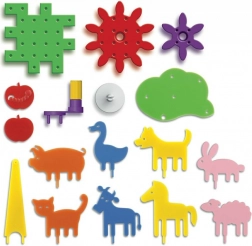 Quercetti Georello Farma je ideální hračkou pro každé dítě, které miluje tvoření a stavění. Tato převodová stavebnice obsahuje perforované desky, osky, převodová kola a figurky zvířátek, které lze jednoduše sestavit do úžasné farmářské scény. Pomocí kličky můžete uvést mechanismus do pohybu, a vidět, jak se vše točí jako na kolotoči.