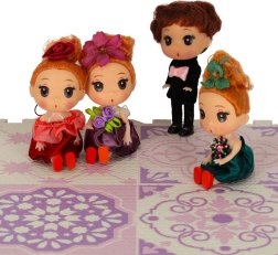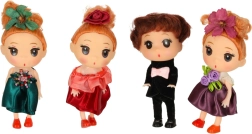 Tato krásná sada minipanenek je ideálním doplňkem do každého domečku pro panenky. Děti si zamilují jejich pečlivé zpracování a elegantní oblečky – chlapec ve fraku s růžovým motýlkem a dívky v šatech v fialové, bordó a námořnické modré barvě, doplněných květinovou ozdobou do vlasů. Oblečky jsou ke panenkám připevněny, takže se nikde neztrácejí.
