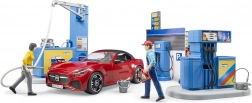 Součástí je variabilní sportovní auto s odnímatelnými koly a střechou, které je plně kompatibilní s figurkami a doplňky BRUDER BWORLD. Oboustranně potištěné kulisy, police s kanystry a ceník podporují kreativní a poučnou hru.