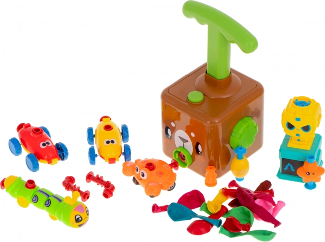 Součástí je roztomilá pumpa s motivem medvídka, 2 autíčka, balonky a další prvky (krab, hvězdice, gąsienice apod.), se kterými lze pořádat závody, pokusy a soutěže o rychlost a dojezd. Díky provozu bez baterií je sada ekologická, tichá a vhodná pro domácí i skupinovou hru.