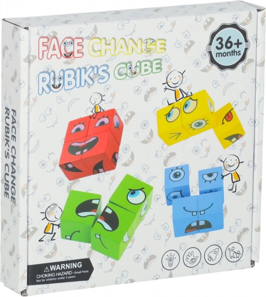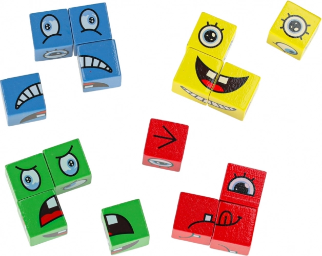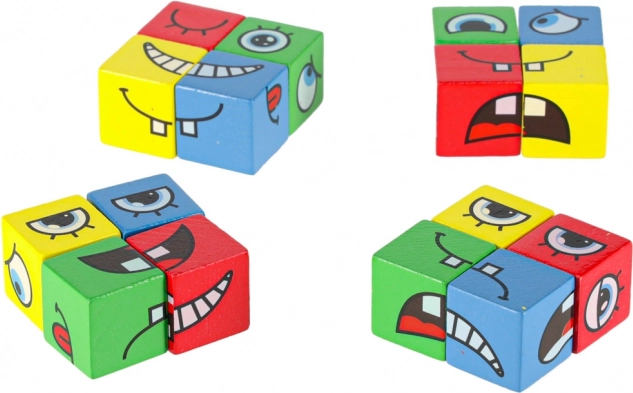 Hladce broušené kostky s potiskem očí a úst umožní skládat desítky výrazů. Pevné, bezpečné a příjemné do ruky.