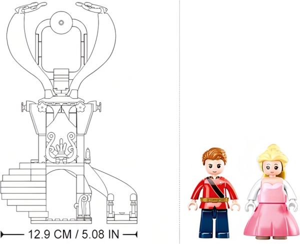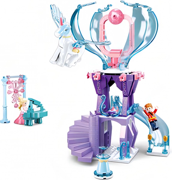 Stavebnice obsahuje nádhernou fialovo-modrou věž s funkčními prvky jako je skluzavka a schodiště.