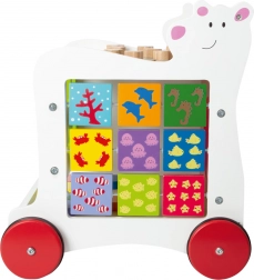 Díky pogumovaným kolečkům je pohyb tichý a šetrný ke všem typům podlah. Chodítko navíc nabízí úložný prostor pro kostky a drobnosti, takže je herní kout vždy rychle uklizený.