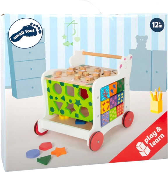 Multifunkční dřevěné chodítko s motivem ledního medvěda nabídne dětem oporu při prvních krůčcích i spoustu zábavy. Rozvíjí hrubou i jemnou motoriku, rozpoznávání tvarů a barev a podporuje kreativitu při kreslení křídou. Stabilní konstrukce, pogumovaná kolečka pro tichý chod a praktický úložný prostor dělají z chodítka skvělého parťáka do každého dětského pokojíčku.