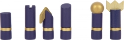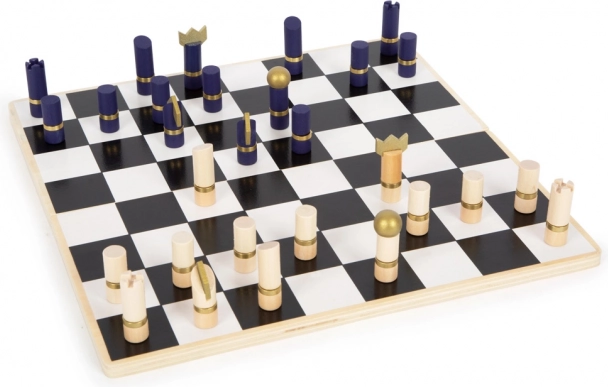 Kombinace půlnoční modré, přírodního dřeva a zlatých akcentů povyšuje klasické hry na moderní doplněk interiéru.