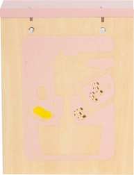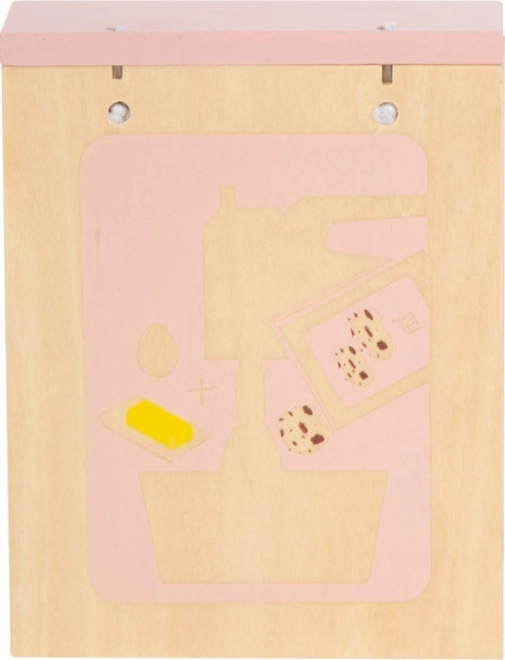 - mísa, váleček, stěrka, plech na pečení, textilní sušenky, dřevěné máslo, vejce na suchý zip, krabička s pečicí směsí a obrázkovým receptem
