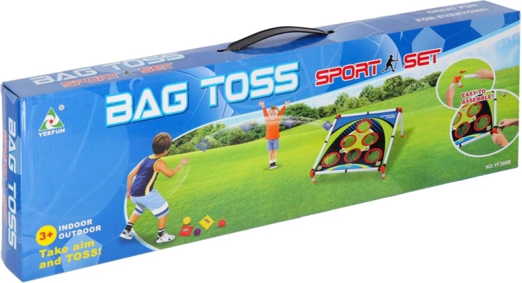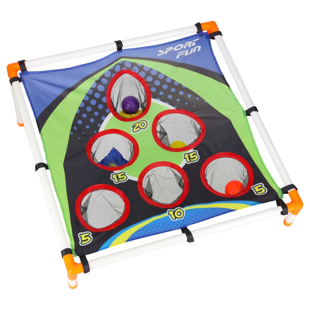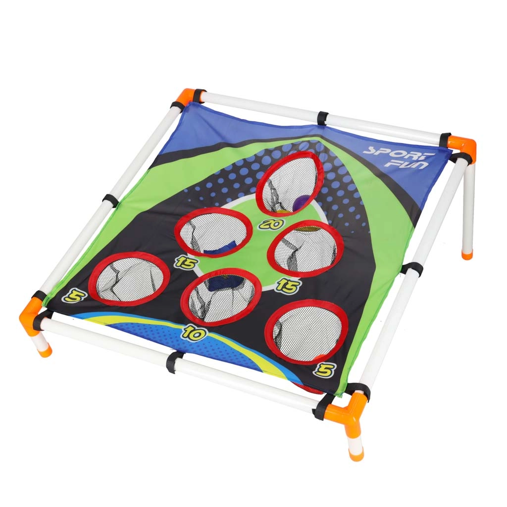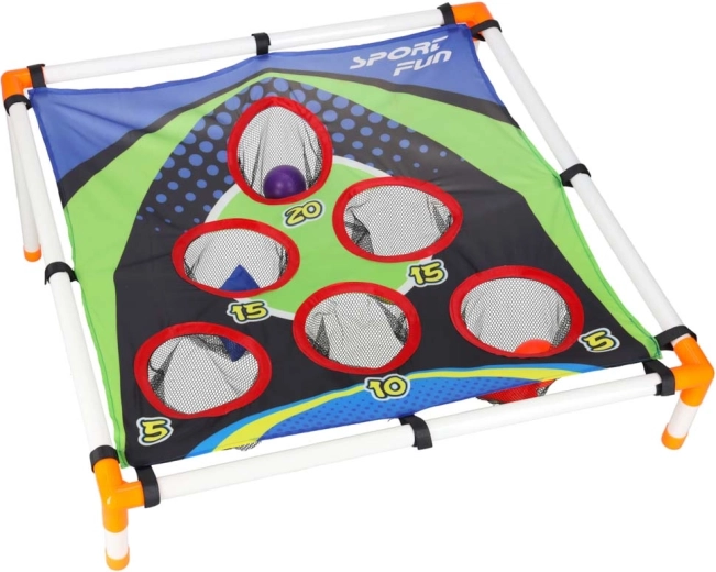 Zábavná házecí hra pro děti rozvíjející koordinaci oko–ruka, přesnost a rychlé reakce. Lehký rám se skloněným terčem s číslovanými otvory nabízí různé bodové výzvy. Vhodné na zahradu i do interiéru, jednoduché sestavení a snadné přenášení. Součástí jsou pytlíky na házení i plastové míčky.