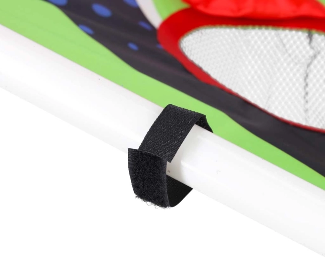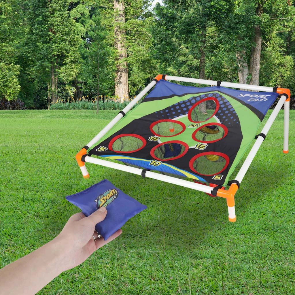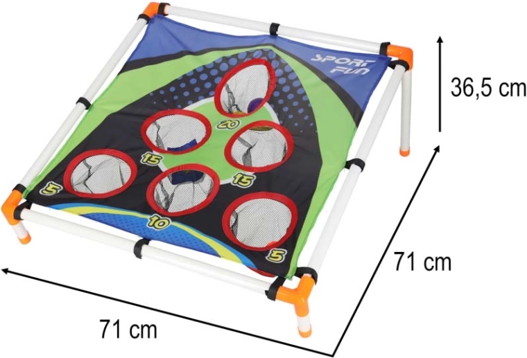 Lehká konstrukce z plastových trubek se sklopeným stojanem zajišťuje stabilitu, pevná textilní plocha s pěti až šesti bodovanými otvory zachytí pytlíky i míčky do síťek. Sestavení je intuitivní a celé hřiště snadno přenesete kamkoli.