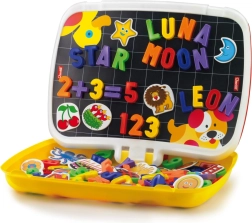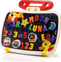 Součástí je bohatá sada magnetek: plastová písmena, čísla a symboly základních operací pro první slova a jednoduché příklady, doplněná o barevné kartonové obrázky pro rozvoj slovní zásoby a fantazie. Kvalitní italské zpracování z odolného, zdravotně nezávadného plastu zaručuje dlouhou životnost a snadnou údržbu.
