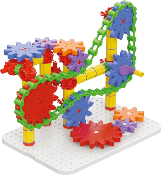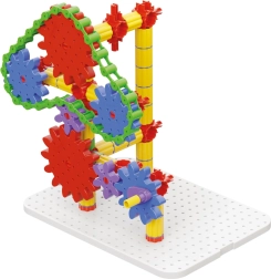 Rozmanité ozubené kolo, hřídele, spojky a podložky umožní tvořit vysoké a funkční konstrukce. Přiložené samolepky dodají stavbám osobitost.