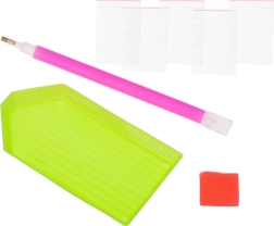 V setu je vše, co potřebujete k vytvoření zářivého uměleckého díla: obrázek, barevné kamínky, aplikátor, suché lepidlo a tácek.