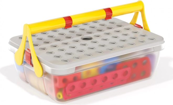 Všechny díly uložíte do pevného boxu s rukojetí. Perforované víko slouží jako stavební plocha – ideální na doma i na cesty.