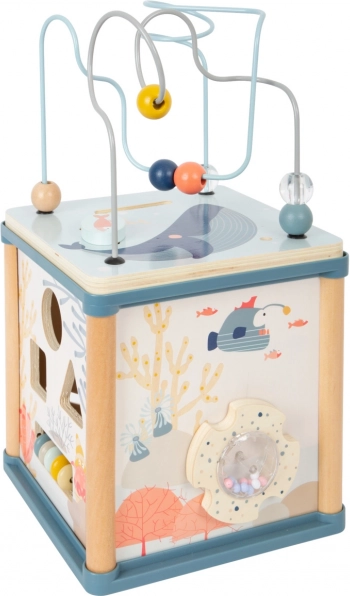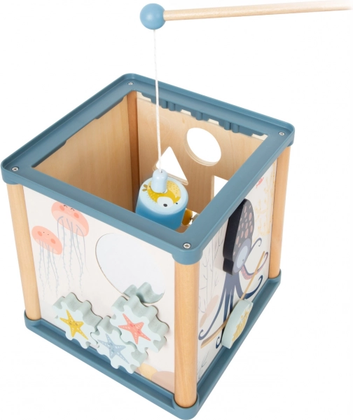 Tato dřevěná aktivní kostka s motivem podmořského světa nabízí pět stran plných aktivit a navíc zábavný magnetický rybolov – dílky z vkládačky lze chytat magnetickou udičkou přímo uvnitř kostky. Barevné ilustrace mořských tvorů podporují zrakové vnímání, pružná chobotnice zase přidává hravý prvek, který děti motivuje k dalším objevům.