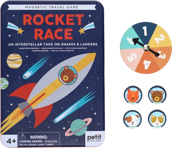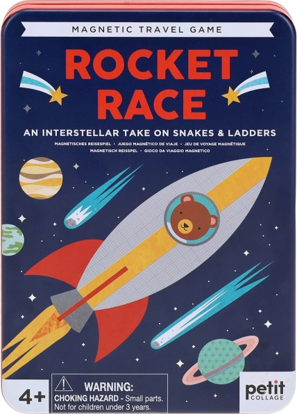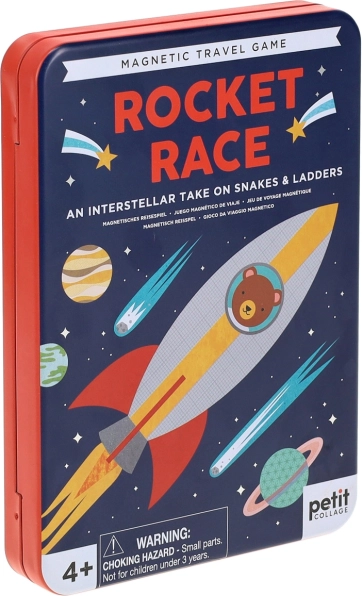 Zažijte vzrušení z vesmírného závodu s touto magnetickou hrou od Petit Collage. Tuto hru v kovové krabičce s veselými ilustracemi si prostě zamilujete. Objevujte vesmírné černo s magnetickými dílky a otočným kolečkem, které posouvá vaši strategii do nové dimenze.
