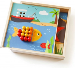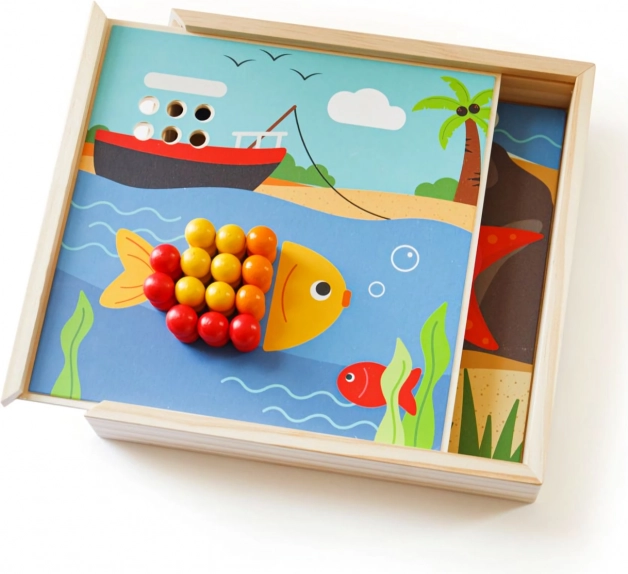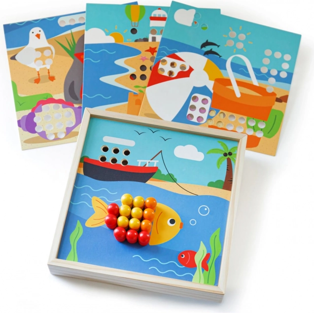 Objevte zábavnou mozaiku s motivy pláže, která rozvíjí dětskou představivost a dovednosti. Obsahuje 4 obrázky a 96 kolíčků v 8 barvách, které děti skládají na víko praktické krabičky. Hra podporuje rozpoznávání barev, jemnou motoriku, soustředění a logické myšlení. Vyrobeno z kvalitního, odpovědně získaného dřeva – příjemné na dotek a ideální na cesty.
