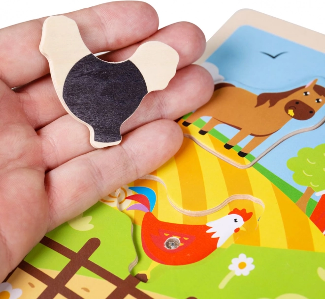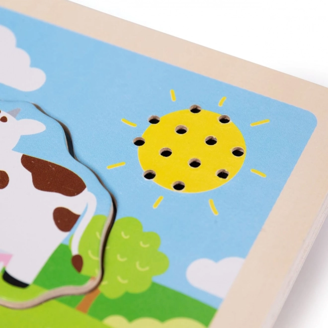 Dřevěná vkládací puzzle zvuková Farma je navržena tak, aby nejen bavila, ale také vzdělávala. Dřevěné dílky mají přizpůsobenou velikost a tvary pro malé dětské ruce, jsou příjemné na dotek a pomáhají stimulovat hmat. Pestré barvy a rozkošné zvířecí tváře snadno upoutají pozornost dětí. Produkt je vyroben z kvalitního dřeva, které je získáno zodpovědně a ošetřeno nezávadnými barvami.