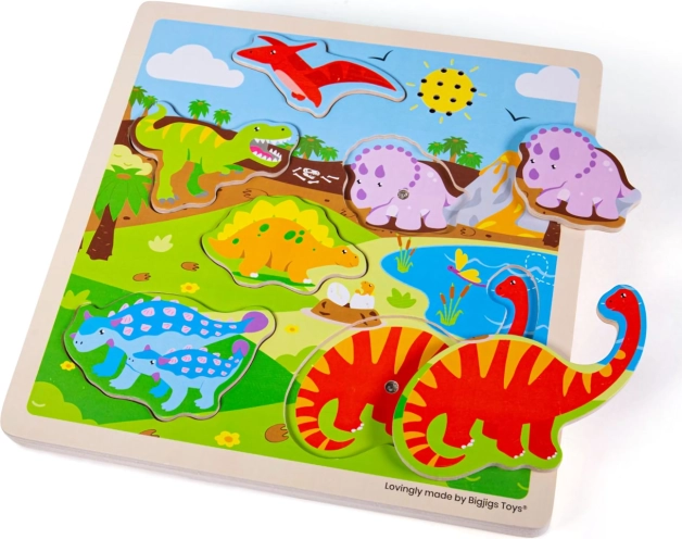 Vkládačka Dinosauři motivuje děti k učení zábavným způsobem. Dřevěné dílky jsou ergonomicky navrženy pro snadnou manipulaci malými ručičkami. Jejich pestré barvy a roztomilé zvukové efekty okamžitě zaujmou pozornost dětí.