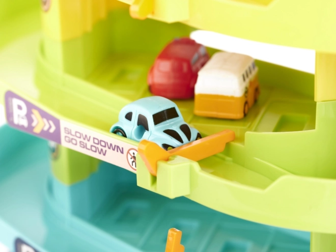 Autíčka vyvezete na střechu stiskem tlačítka – výtah doprovází světla a veselá melodie. Při výpadku lze ovládat ručně, takže hra nikdy nekončí.
