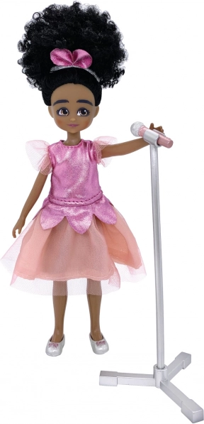 Panenka je vybavena bílým kožichem, růžovou sukní a mikrofonem na stojanu, které dokonale doplňují její hvězdný outfit.