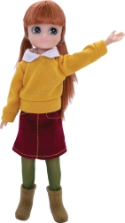 - Podzimní model: žlutý svetřík s límečkem, vínová manšestrová sukně, zelené punčocháče, hnědo-zelené boty