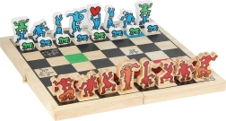 Objevte ikonické šachy v jedinečném stylu KEITH HARING. Dřevěná skládací hrací deska a 32 odolných figurek s barevnými motivy přinášejí atraktivní design, rozvíjejí soustředění a strategické myšlení a zároveň se stanou nepřehlédnutelnou ozdobou dětského pokoje, klubovny či herny.