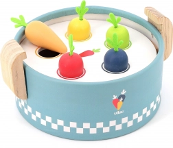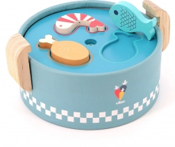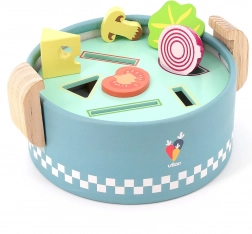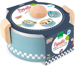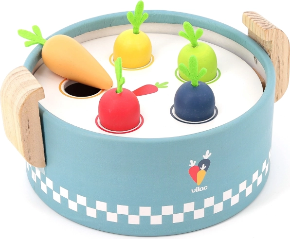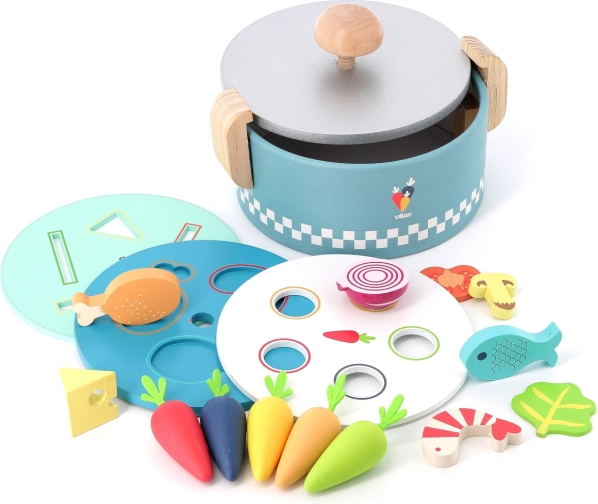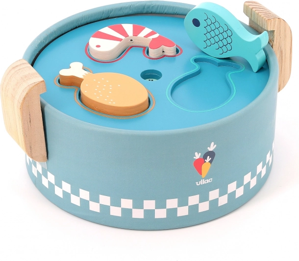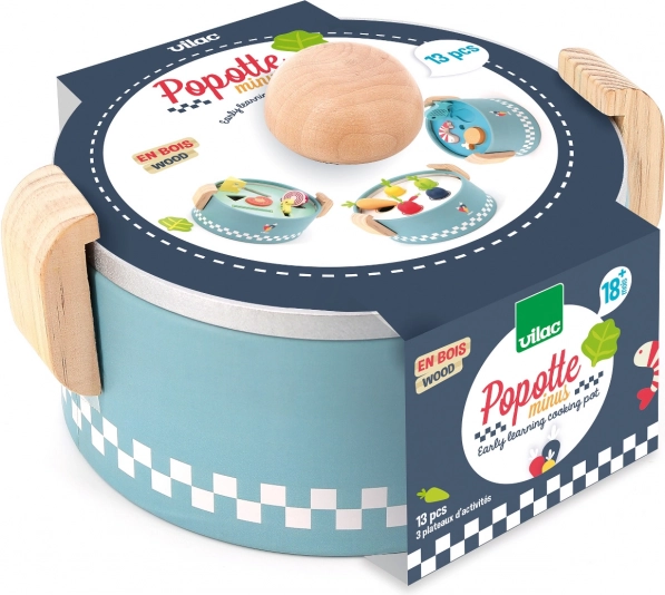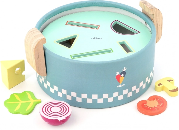 VILAC vkládací mini hrnec je chytrá dřevěná hračka pro nejmenší od 18 měsíců. Pod víkem se ukrývají tři vyměnitelné desky s různými tvary, do kterých děti vkládají nebo vhazují barevné kousky potravin. Vzniká tak „vaření“ jako doopravdy, které rozvíjí fantazii i praktické dovednosti.