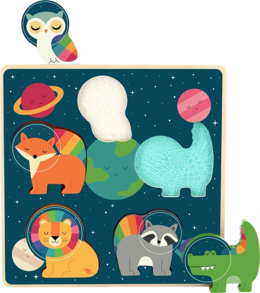 Potěšte své děti vkládacím puzzle s motivem zvířecích astronautů, které nejen zaujme svou originalitou, ale i stimulujícím provedením. Každý dílek ukrývá pod svou texturou jiný povrch, což rozšiřuje možnosti poznávání a rozlišování rozdílných vjemů.
