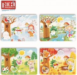S touto chytrou sadou se děti naučí rozlišovat roční období a typické činnosti pro každé z nich – od stavění sněhových koulí po sběr lesních plodů a hub. Odolné, příjemné plastové dílky se snadno připevňují na destičky pomocí suchého zipu, takže nesklouzávají a drží na správném místě.