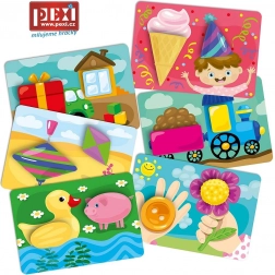 Pexi Velcro skládačky nabízejí kreativní a vzdělávací zábavu pro děti od 12 měsíců. Sada obsahuje 6 pružných plastových destiček se suchým zipem a 12 větších samostatných dílků, které snadno připevníte pomocí suchého zipu. Díky tomu dílky drží pevně na místě a zároveň jsou snadno přemístitelné.