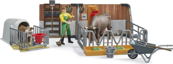 Umožněte dětem stát se malými farmáři s touto detailní farmářskou sadou. Sada zahrnuje dva kotce: jeden pro tele a větší pro krávu, oba vybaveny napajedlem a krmítkem. Děti si užijí hraní s pohyblivou figurkou farmáře a realistickými nástroji, což jim přiblíží každodenní život na farmě.