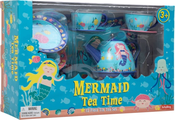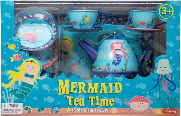 Když je čas na čaj, není lepší volby než tato nádherná kovová čajová souprava. Kreativita stoupá, když vaše děti hostí kamarády, panenky a plyšové hračky s touto krásnou čajovou sadou. Sada obsahuje 4 šálky s podšálky, 4 dezertní talířky, konvici na čaj s pokličkou a servírovací tác, vše v designu mořských pannen.