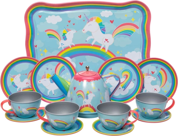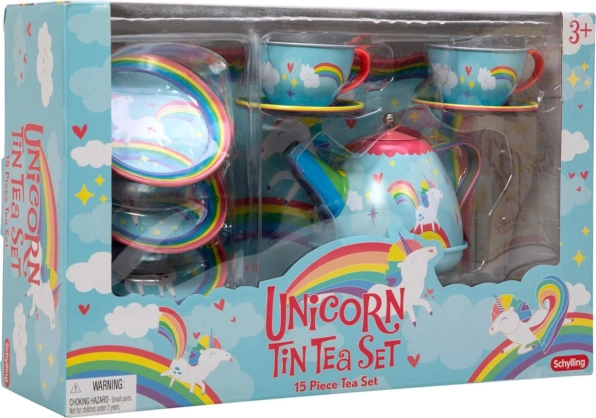 Rozkošná čajová souprava s motivem jednorožce potěší malé hostitelky i hostitele. Obsahuje 15 dílů z odolného kovu – šálky, podšálky, talířky, konvičku s pokličkou a servírovací tác 24 × 16 cm. Ideální pro předstírané čajové dýchánky a rozvoj kreativity i sociálních dovedností. Vhodné pro děti od 3 let.