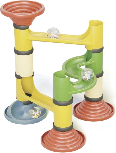 S touto jedinečnou stavebnicí mohou děti rychle a intuitivně postavit různé kuličkové dráhy díky snadnému spojování. Všechny části jsou vyrobeny z inovativního bioplastu, který kombinuje dřevěná vlákna a plast. Tato ekologická volba výrazně snižuje emise CO2 při výrobě a materiály jsou 100% recyklovatelné. Hračka nejenže vypadá a voní jako dřevo, ale je také odolná a příjemná na dotek.