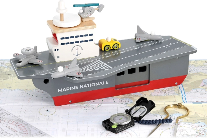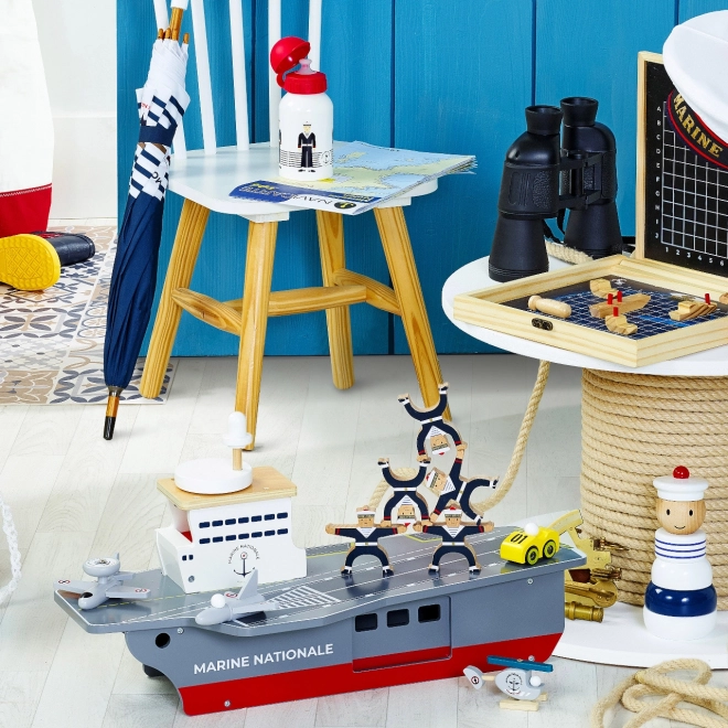 Tato precizně zpracovaná dřevěná letadlová loď věrně napodobuje skutečné nosiče letadel včetně označení Marine Nationale. Je vyrobena z odolné, a přesto lehké překližky, takže je stabilní a pohodlně se s ní manipuluje i menším dětem. Realistické malované detaily a promyšlené prvky podněcují představivost a přinášejí autentický námořní zážitek.