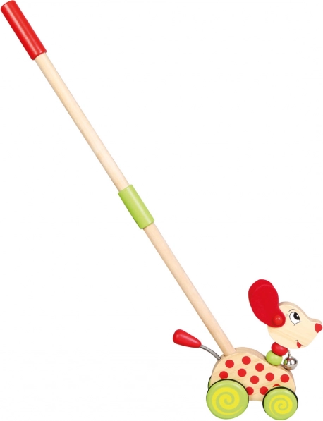 Dřevěný jezdík pejsek na tyči od značky Bino je oblíbená pohybová hračka, která motivuje děti k chůzi a aktivnímu pohybu. Při tlačení před sebou pejsek s rolničkou jemně cinká, což děti baví a podněcuje k dalším krůčkům. Pogumovaná kolečka zajišťují plynulý a tichý chod na různých površích.