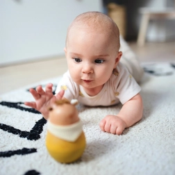Interaktivní hračka s rolničkou uvnitř, která stimuluje sluchové vnímání při každém pohybu. Samostatně se postavící mechanismus rozvíjí motorické dovednosti.