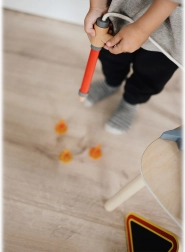 Součástí sady je dřevěná „hadice“ a stříkačka, se kterou děti snadno „uhasí“ každý plamínek. Podporuje fantazii a rozvoj jemné motoriky.
