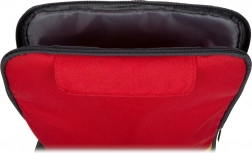 Batoh v červeno‑žlutém provedení má dvojitý zip pro rychlé otevření, nastavitelné ramenní popruhy pro pohodlné nošení a dvě přezky pro uchycení příslušenství. Dřevěné a plastové komponenty jsou příjemné do ruky a vydrží intenzivní hraní.