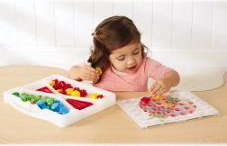 Mozaika v praktickém kufříku umožňuje dětem skládat veselé obrázky podle přiložených šablon nebo dle vlastní fantazie. Desku lze zasunout do opěrek a používat ji i ve svislé poloze pro ještě pohodlnější hraní. Velké, barevné kloboučky jsou bezpečné a snadno uchopitelné i pro malé dětské ruce.