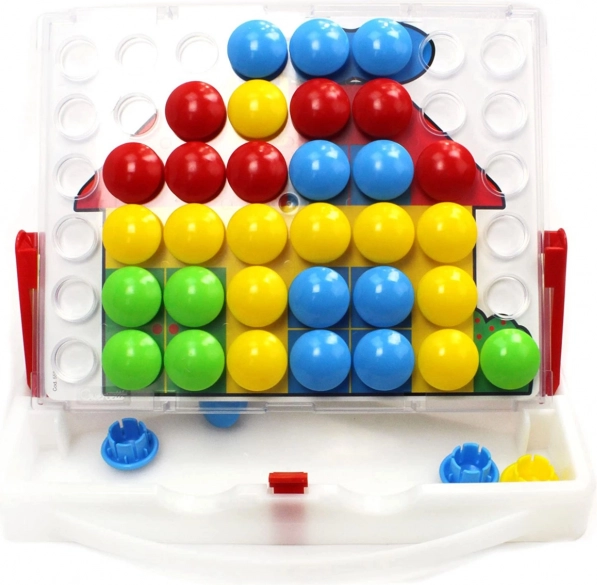 - 48 kloboučků (4 barvy), 8 oboustranných karet s předlohami, děrovaná deska, kufřík
