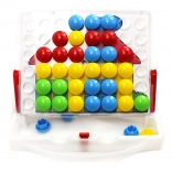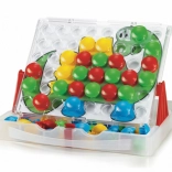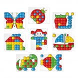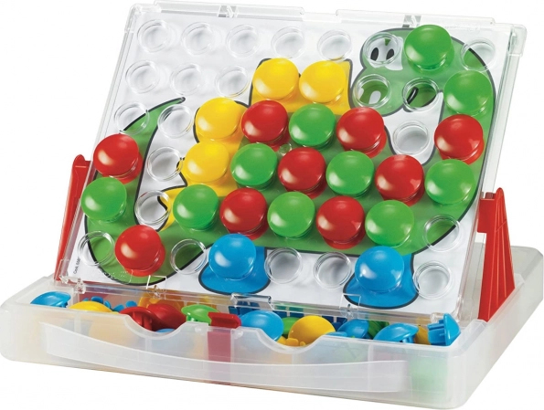 Mozaika v praktickém kufříku umožňuje dětem skládat veselé obrázky podle přiložených šablon nebo dle vlastní fantazie. Desku lze zasunout do opěrek a používat ji i ve svislé poloze pro ještě pohodlnější hraní. Velké, barevné kloboučky jsou bezpečné a snadno uchopitelné i pro malé dětské ruce.