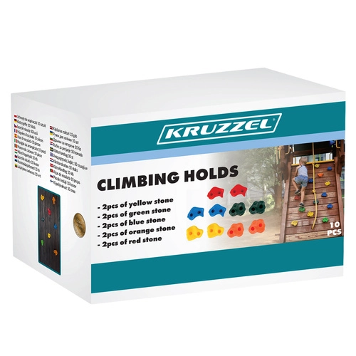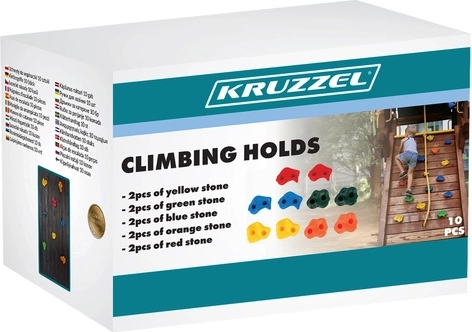 Chyty KRUZZEL se montují na 2 šrouby, což zabraňuje jejich otáčení a zvyšuje bezpečnost při používání. Texturovaný, protiskluzový povrch zajišťuje jistotu pro ruce i nohy. Různé tvary a velikosti umožňují více možností uchopení dle způsobu přitažení. Skvělé pro stavbu lezeckých stěn, žebříků, věží a dalších konstrukcí.