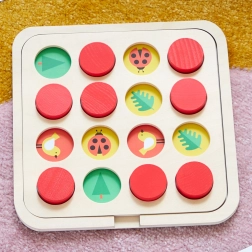 Hrací deska se 16 krycími kotouči je navržena pro malé hráče od 3 let. Podporuje rozvoj kognitivních dovedností, rozpoznávání tvarů a barev i trénink trpělivosti a soustředění. Ilustrace jsou výrazné, hravé a snadno čitelné.