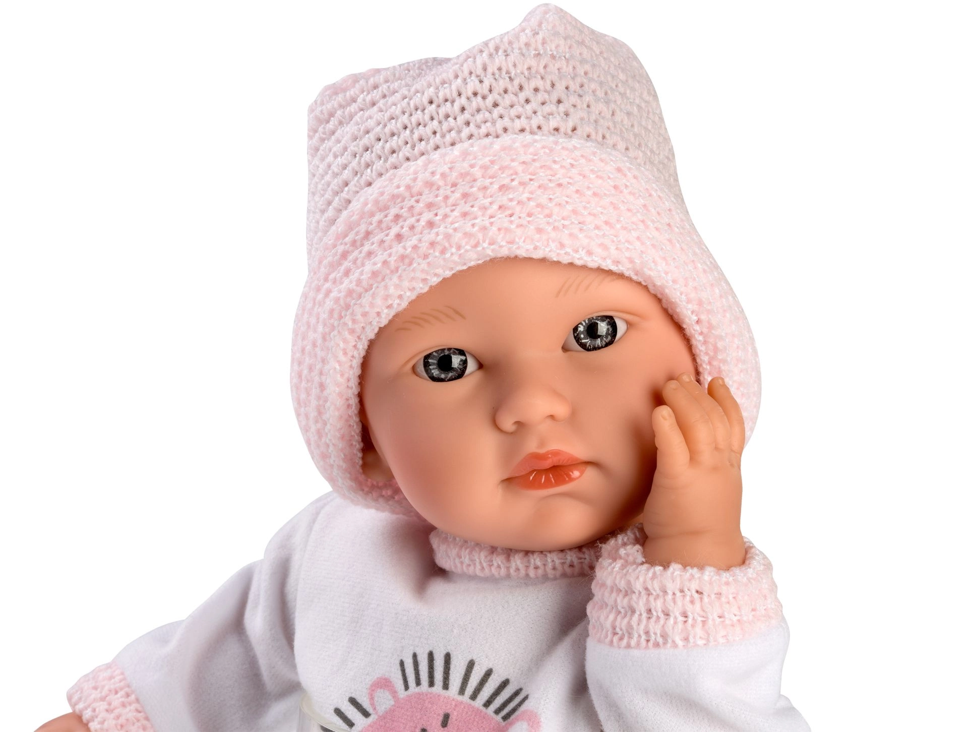 Po stisknutí bříška panenka zapláče a zavolá „máma, táta“, čímž podporuje empatickou hru a rozvoj sociálních dovedností. Obleček s roztomilým potiskem a pletená čepička se snadno oblékají a svlékají, což rozvíjí jemnou motoriku.