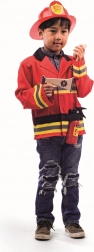 Dětský hasičský kostým BIGJIGS TOYS nabízí vše, co malí hasiči potřebují pro napínavou záchrannou misi. Jasně červená bunda s pruhovanými rukávy a emblémem, nastavitelná helma (49–55 cm) a doplňky jako dřevěný hasicí přístroj, vysílačka a megafon dávají hře realistický rozměr.