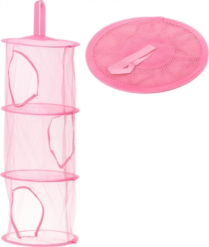 Závěsný organizér na hračky se 3 přihrádkami ze síťoviny. Lehký, odolný a úsporný na místo. Světle růžový design pro přehledný dětský pokoj.